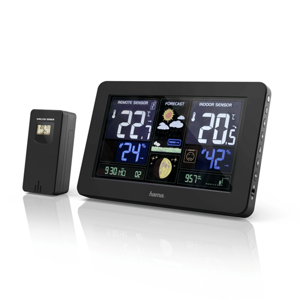 | descripcion_html | Hama Premium. Color del producto: Negro, Funciones de medición: Barómetro de interior, Higrómetro de interior, Termómetro de interior, Higrómetro de exterior,..., Tendencia en pantalla de función de medida: Barómetro. Fuente de energía: Batería, Tipo de batería: AA Mignon. Ancho: 205 mm, Profundidad: 30 mm, Altura: 130 mm. Número de baterías incluidas: 2 pieza(s)