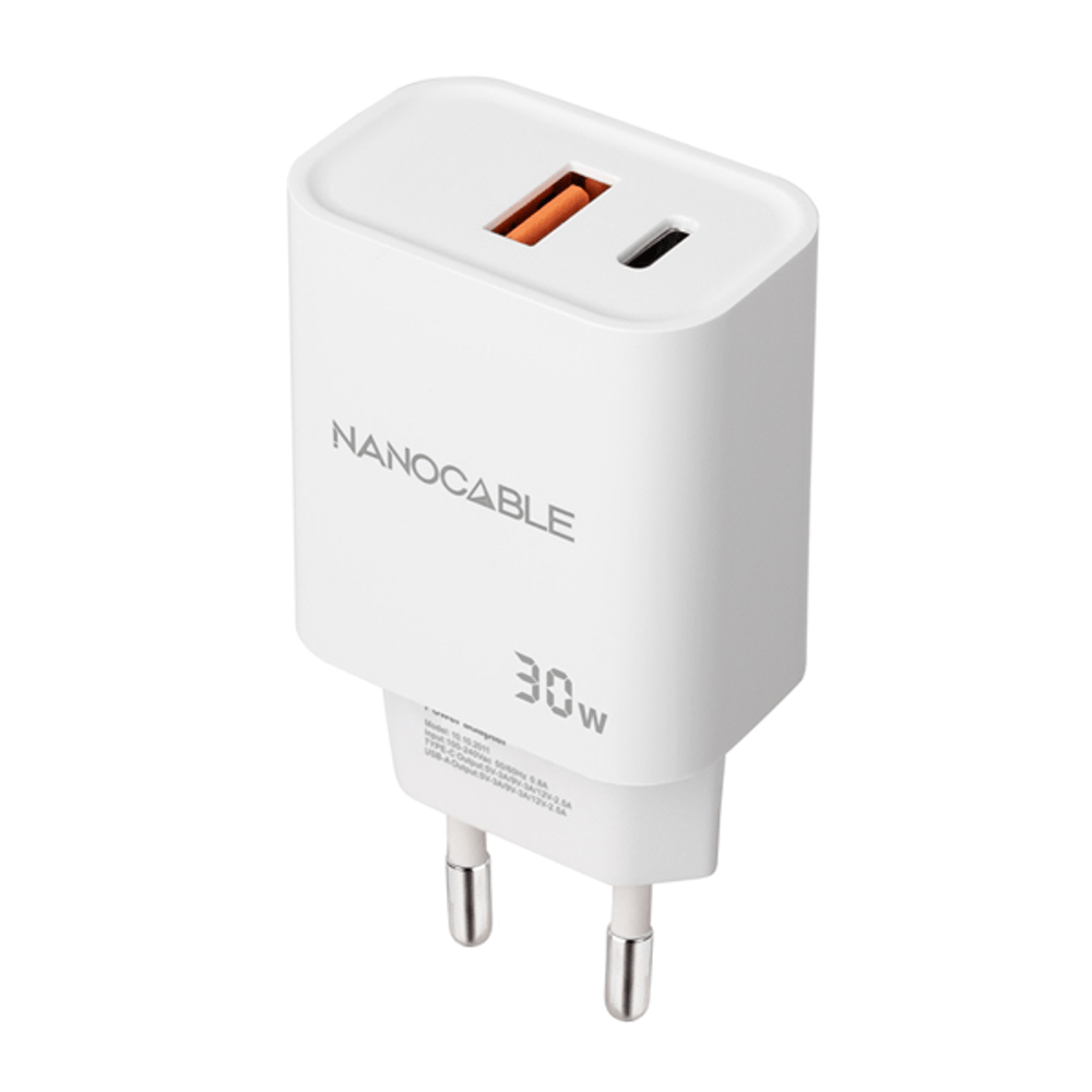 | descripcion_html | Nanocable Cargador USB-C/PD + USB-A/QC 30W, Blanco. Tipo de cargador: Interior, Alimentación: Corriente alterna, Compatibilidad del cargador: Universal. Voltaje de entrada: 100 - 240 V, Voltaje de salida máximo: 20 V. Número de puertos USB Tipo C: 1, Carga rápida. Color del producto: Blanco