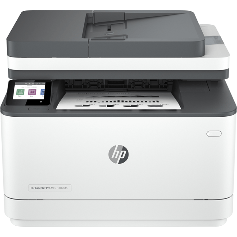 HP LaserJet Pro MFP 3102fdn Printer; HP Black LaserJet Toner Introductory Cartridge (yield ~1000 pages); Setup Guide; Reference Guide; Regulatory Flyer; Warranty Guide; Power cord |