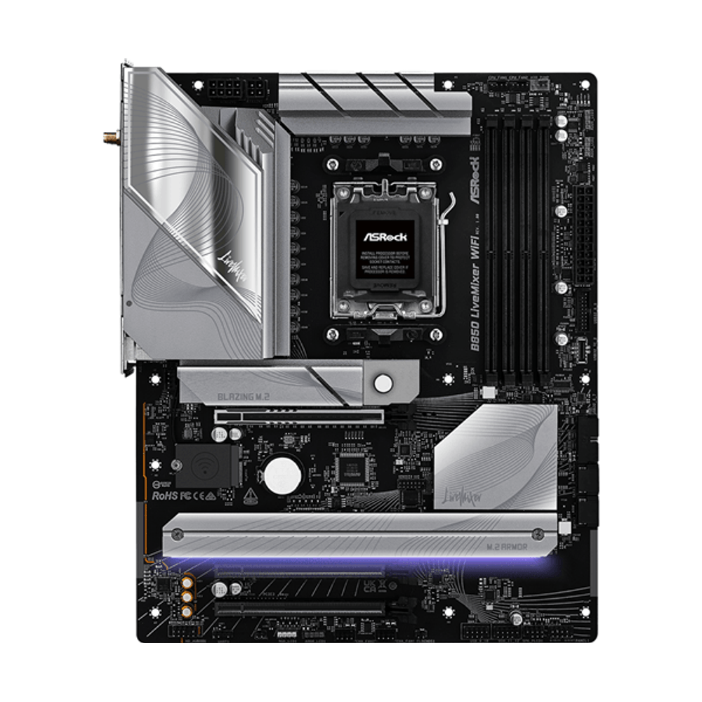 | descripcion_html | Asrock B850 LiveMixer WiFi. Fabricante de procesador: AMD, Socket de procesador: Zócalo AM5, Procesador compatible: AMD Ryzen 7000 Series, AMD Ryzen 8000 Series, AMD Ryzen 9000 Series. tipos de memoria compatibles: DDR5-SDRAM, Memoria interna máxima: 256 GB, Tipo de ranuras de memoria: DIMM. Interfaces de disco de almacenamiento soportados: PCI Express 4.0, PCI Express 5.0, SATA III, Tipos de unidades de almacenamiento admitidas: HDD & SSD, Niveles RAID: 0, 1, 10. Máxima resolución: 3840 x 2160 Pixeles. Conector USB: USB tipo A, USB Tipo C