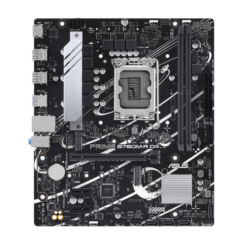 | descripcion_html | ASUS PRIME B760M-R D4. Fabricante de procesador: Intel, Socket de procesador: LGA 1700, Procesador compatible: Intel Core i3 12th Gen, Intel Core i3 13th Gen, Intel Core i5 12th Gen, Intel Core i5 13th Gen,.... tipos de memoria compatibles: DDR4-SDRAM, Memoria interna máxima: 64 GB, Tipo de ranuras de memoria: DIMM. Interfaces de disco de almacenamiento soportados: M.2, SATA III, Tipos de unidades de almacenamiento admitidas: HDD & SSD, Niveles RAID: 0, 1, 5, 10. Tipo de interfaz ethernet: 2.5 Gigabit Ethernet. Componente para: PC, Factor de forma: micro ATX, Familia del chipset: Intel