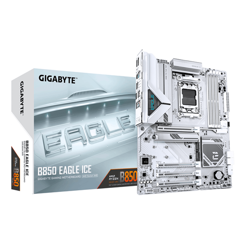 | descripcion_html | GIGABYTE B850 EAGLE ICE Placa Base – Procesadores AMD Ryzen serie 9000, VRM digital de 8+2+2 fases, hasta 8200 MHz DDR5 (O.C), 1 x M.2 PCIe 5.0 + 2 x M.2 PCIe 4.0, LAN 2.5 GbE, USB 3.2 Gen 2. Fabricante de procesador: AMD, Socket de procesador: Zócalo AM5, Procesador compatible: AMD Ryzen 7000 Series, AMD Ryzen 8000 Series, AMD Ryzen 9000 Series. tipos de memoria compatibles: DDR5-SDRAM, Memoria interna máxima: 256 GB, Tipo de ranuras de memoria: DIMM. Interfaces de disco de almacenamiento soportados: M.2, PCI Express 4.0, PCI Express 5.0, SATA III, Tipos de unidades de almacenamiento admitidas: HDD & SSD, Niveles RAID: 0, 1, 10. Máxima resolución: 4096 x 2160 Pixeles. Tipo de interfaz ethernet: 2.5 Gigabit Ethernet, Controlador LAN: Realtek RTL8125