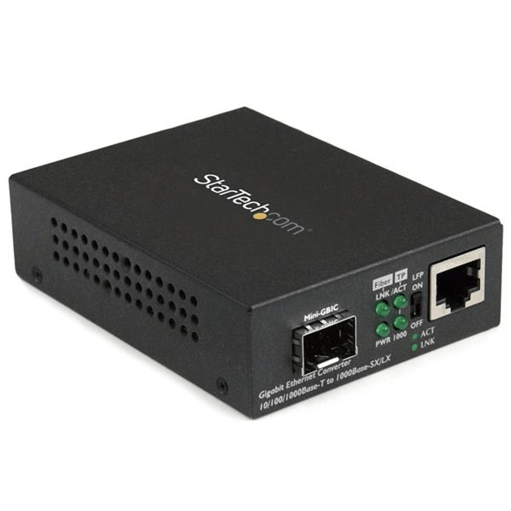 | descripcion_html | StarTech.com Conversor de Medios Ethernet Gigabit a Fibra con SFP abierto. Rango máximo de transferencia de datos: 1000 Mbit/s, Interfaz de convertidor de entrada: 1000Base-T, 100Base-TX, 10Base-T, Interfaz de convertidor de salida: 1000Base-LX, 1000Base-SX. Conector fibra óptica: SFP, Tecnología de conectividad: Alámbrico. Estructura de modo de fibra: Multimodo, Monomodo, Tiempo medio entre fallos: 50000 h. Indicadores LED: Actividad, Enlace, Poder, Color del producto: Negro, Material de la carcasa: Acero. Voltaje de entrada: 100 - 240 V, Corriente de entrada: 1 A, Voltaje de salida: 5 V