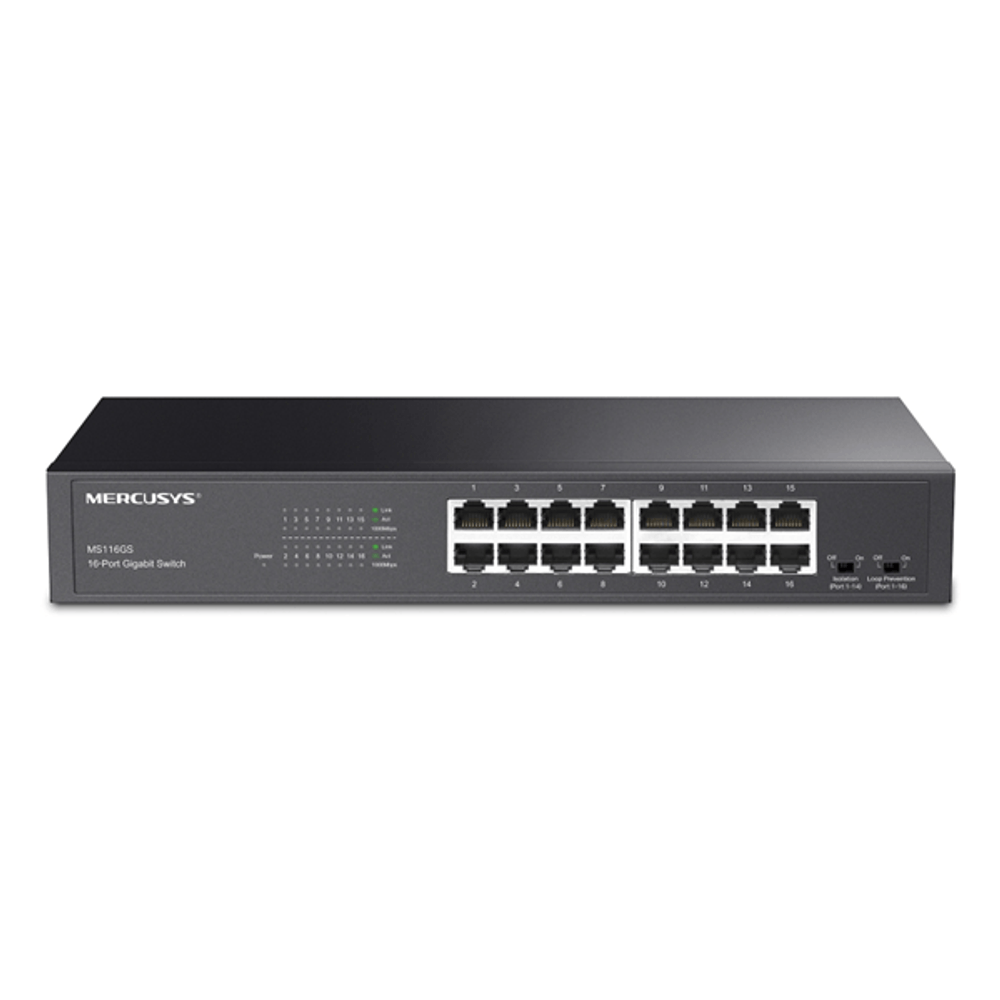 | descripcion_html | Mercusys MS116GS. Puertos tipo básico de conmutación RJ-45 Ethernet: Gigabit Ethernet (10/100/1000), Cantidad de puertos básicos de conmutación RJ-45 Ethernet: 16. Tabla de direcciones MAC: 8000 entradas, Capacidad de conmutación: 32 Gbit/s. Estándares de red: IEEE 802.1p, IEEE 802.3ab, IEEE 802.3i, IEEE 802.3u, IEEE 802.3x. Montaje en rack
