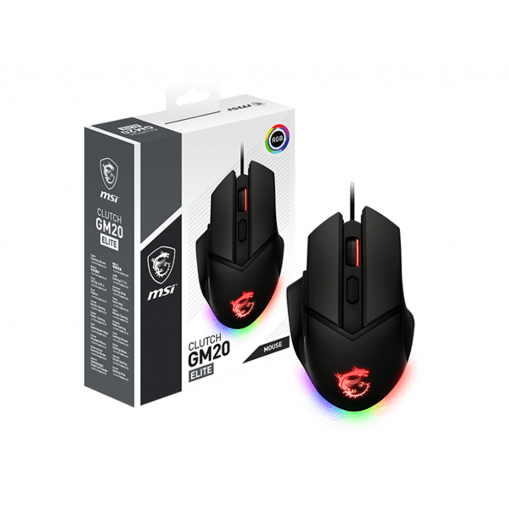 | descripcion_html | MSI Clutch GM20 Elite. Factor de forma: mano derecha. Tecnología de detección de movimientos: Óptico, Interfaz del dispositivo: USB tipo A, Resolución de movimiento: 6400 DPI, Tipo de botones: Botones presionados, Cantidad de botones: 6, Tipo de desplazamiento: Rueda. Iluminación de color: Multi. Fuente de energía: Cable. Color del producto: Negro