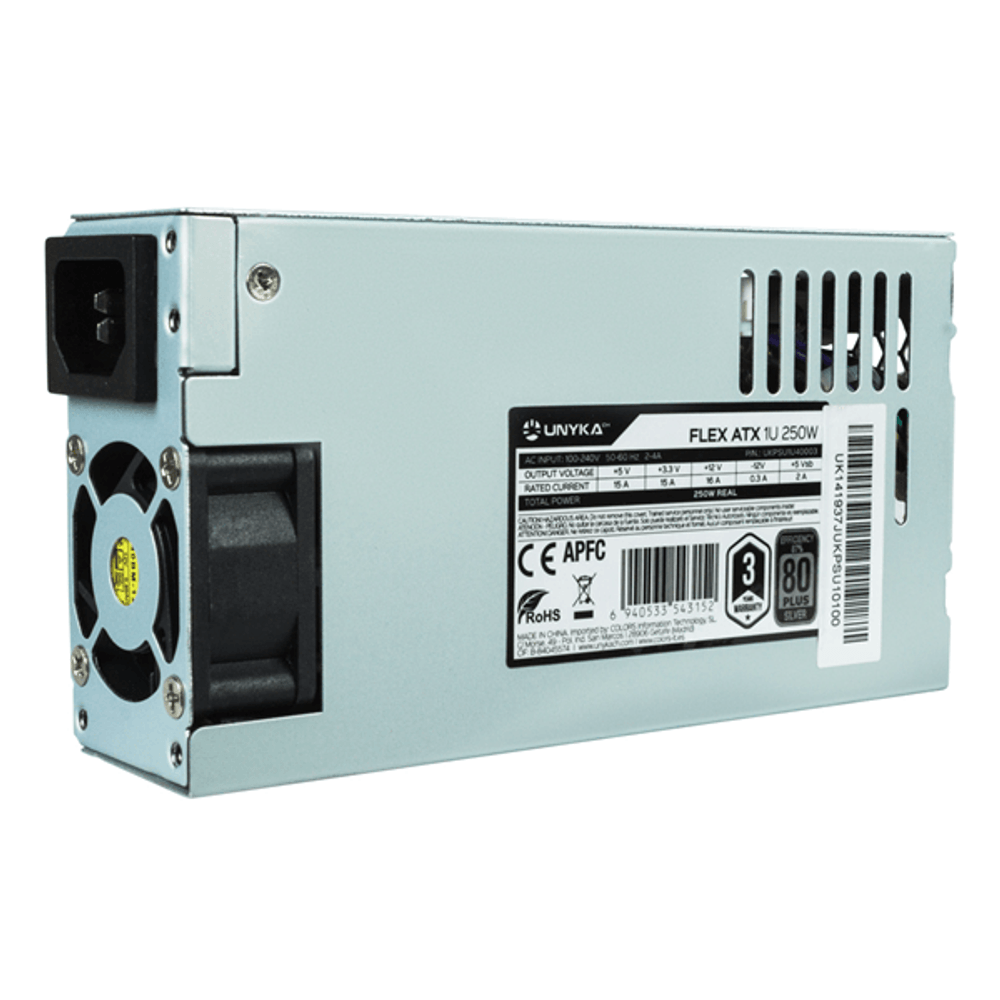 | descripcion_html | UNYKAch UKPSU1U40003. Potencia total: 250 W, Voltaje de entrada AC: 100 - 250 V, Frecuencia de entrada AC: 50 - 60 Hz. Alimentador de energía para tarjeta madre: 20+4 pin ATX, Longitud del cable de alimentación de la placa base: 33 cm, Longitud del cable de alimentación periférico (Molex): 470,620 mm. Utilizar con: Servidor, Factor de forma de fuente de alimentación (PSU): 1U, Certificación: CE. Color del producto: Plata, Tipo de enfriamiento: Activo, Diámetro de ventilador: 4 cm. Ancho: 85 mm, Profundidad: 150 mm, Altura: 40 mm